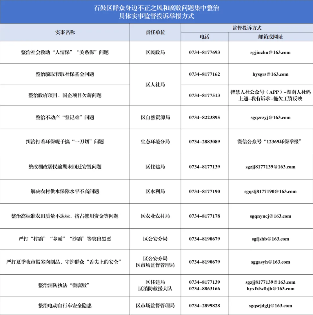群众身边不正之风和腐败问题集中整治开展以来,全区各级纪检监察机关(机构)紧扣“四个聚焦”整治内容,坚持走好群众路线、紧盯群众关切、超常规发力、“小切口”整治,有力推动查办了一批漠视侵害群众利益的典型案件,整治了一批反映强烈的突出问题,办成了一批可感可及的民生实事。为上下贯通系统抓好中央纪委国家监委统一部署、省市纪委监委强力推进的集中整治15件群众身边具体实事,广泛听取群众意见,受理群众投诉,接受群众监督,现结合全区实际,将12件具体实事名称、区级责任单位、监督投诉举报方式等集中公布如下: