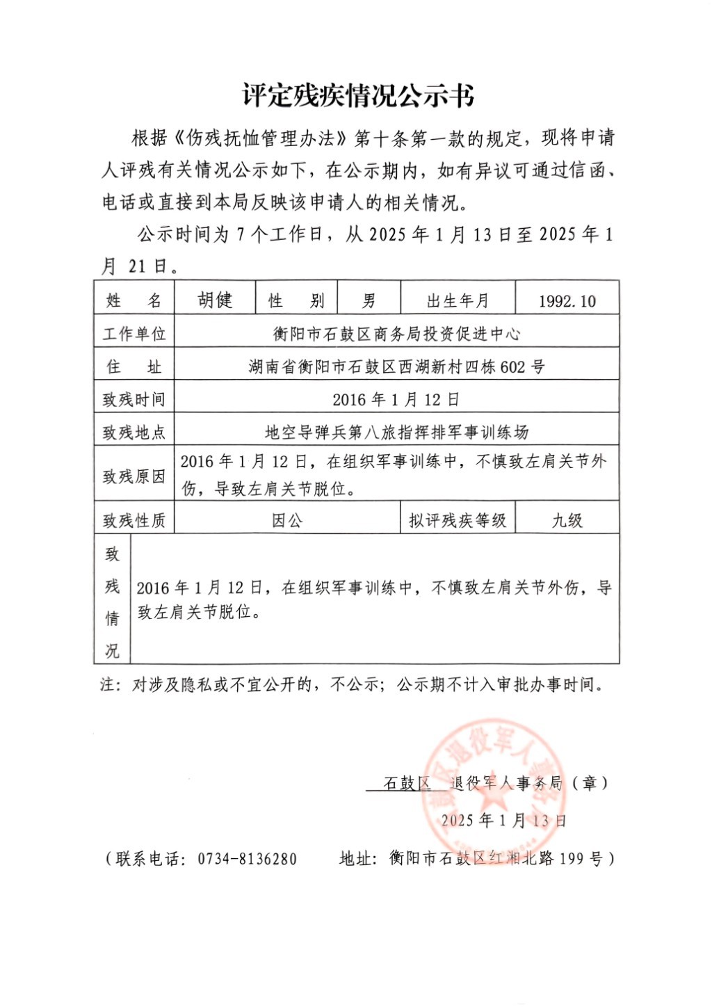 【星空全站精简版APP退役军人事务局】评定残疾情况公示书